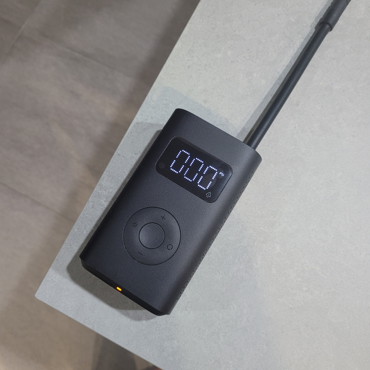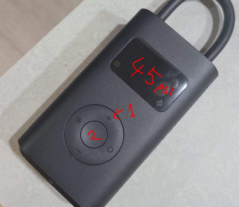 그리고 더하기 버튼을 눌러 적정 타이어 압력을 세팅하고 가운데 있는 동그란 버튼을 누르면 공기주입이 시작된다.