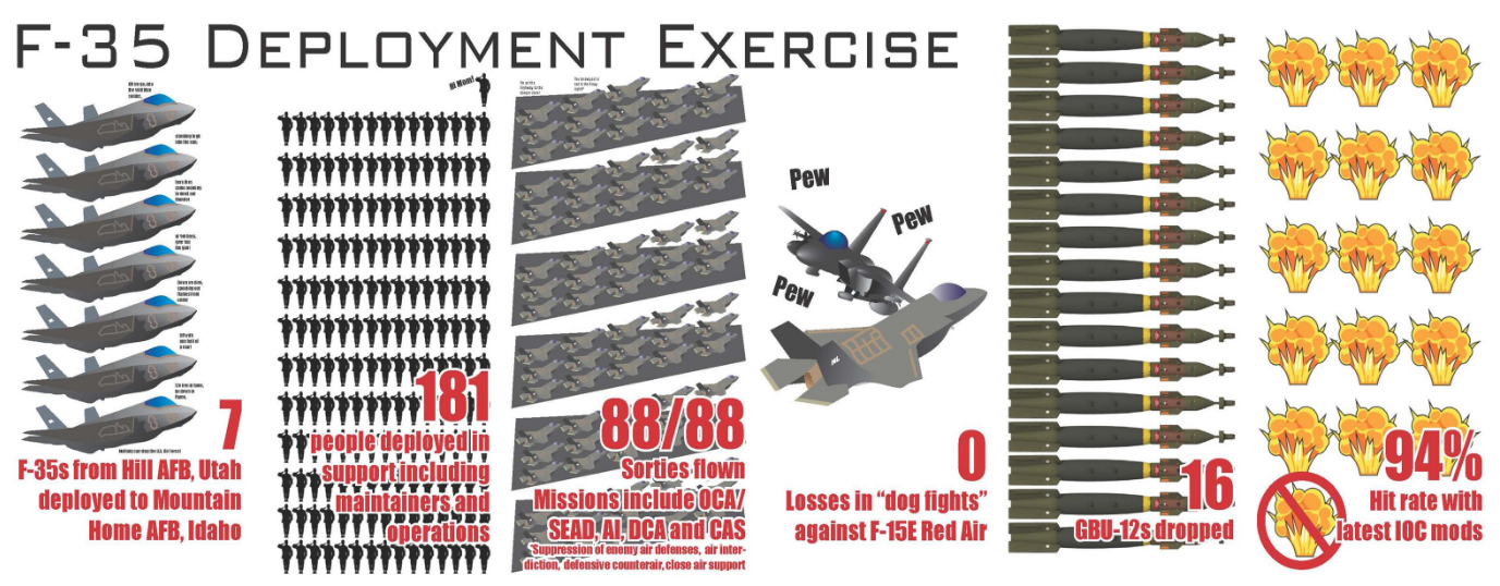 * 2017년 2월 네바다주 넬리스 공군기지에서 열리는 레드플래그(Red Flag) 훈련에서 미 공군의 F-35A는 다른 전투기들을 상대로 20대 1의 결과를 거둠. (F-35A 1대가 격추되는 동안 다른 전투기들 20대가 요격된다는 뜻)