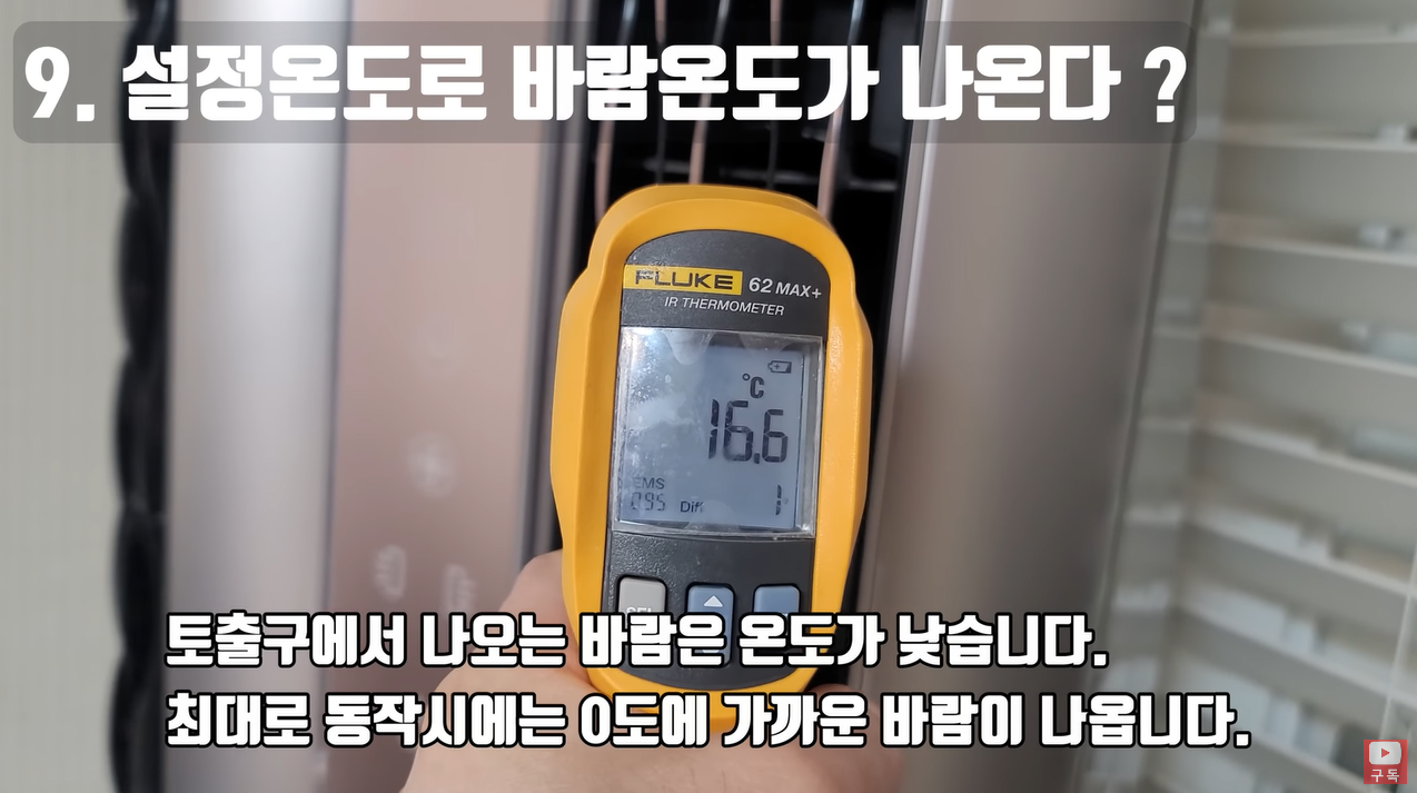 토출구에서 26도 바람 나오면 집안전체 26도로 낮추는데 얼마나 오래걸리겠어요. 최대 동작시 0도에 가까운 바람이 나온다는건 신기하네요! 우리가 몰랐던 에어컨의 세계~