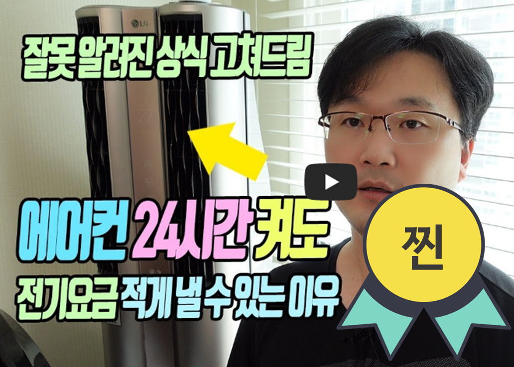 누적조회수 402만, 씨디맨님 영상. 에어컨을 가동하며 실제로 전력측정기기로 전력사용량을 확인하며 하나하나 짚어준 아주 좋은 영상입니다. 에어컨 전기요금에 대해 잘못된 상식이 많은데 그런걸 모두 바로잡아주는 영상이라고 할수 있겠네요.